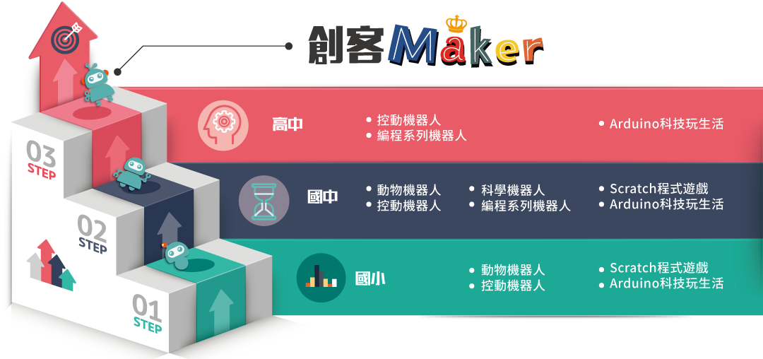 思頂創客致力於提供基礎機器人教育、程式設計教育,我們期許能讓對機械動力、程式設計有興趣的同學們,在寒暑假、課後社團有機會接觸到相關領域的課程,並進一步參與競賽活動,發掘個人天賦。